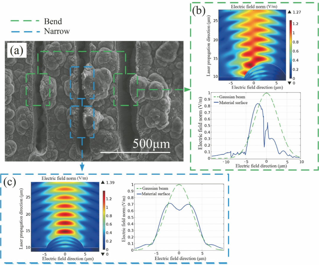 CMC-SiC主要由最外側(cè)的SiC層和內(nèi)部的SiC基體、纖維及界面層組成,在纖維編織結(jié)構中還包含許多微小孔隙,復雜的材料結(jié)構致使CMC-SiC在激光加工過程中會產(chǎn)生與一般均質(zhì)材料不同的物理和化學變化。在纖維增強復合材料與激光相互作用機理方面,國內(nèi)外學者基于理論與實驗進行了大量探索。吳恩啟等理論研究了碳纖維增強復合材料的熱傳導規(guī)律,推導出了復合材料內(nèi)部纖維束平面內(nèi)熱擴散系數(shù)與相位梯度的關系。纖維編織復合材料具有各向異性的特點,纖維束方向會直接影響熱傳導規(guī)律,且復合材料的熱擴散系數(shù)與編織方式和基體材料分布相關。Allheily等研究了高能量激光對碳纖維增強復合材料的燒蝕機制,發(fā)現(xiàn)碳纖維增強復合材料對激光輻照產(chǎn)生的熱量具有很強的隔絕作用,主要原因在于碳纖維能夠承載并吸收熱量,層間基體材料的燒蝕可以有效降低激光能量的積累。Zhai等使用波動光學仿真軟件分析了C/SiC原始表面粗糙度對激光加工效果的影響,仿真結(jié)果表明C/SiC原始表面形貌對激光刻蝕效果有顯著影響,激光輻照在C/SiC表面凸起的不同位置時,電場會發(fā)生偏移或減弱,電場強度的不均勻分布導致C/SiC表面不同區(qū)域的刻蝕形貌存在差異,如圖2所示。