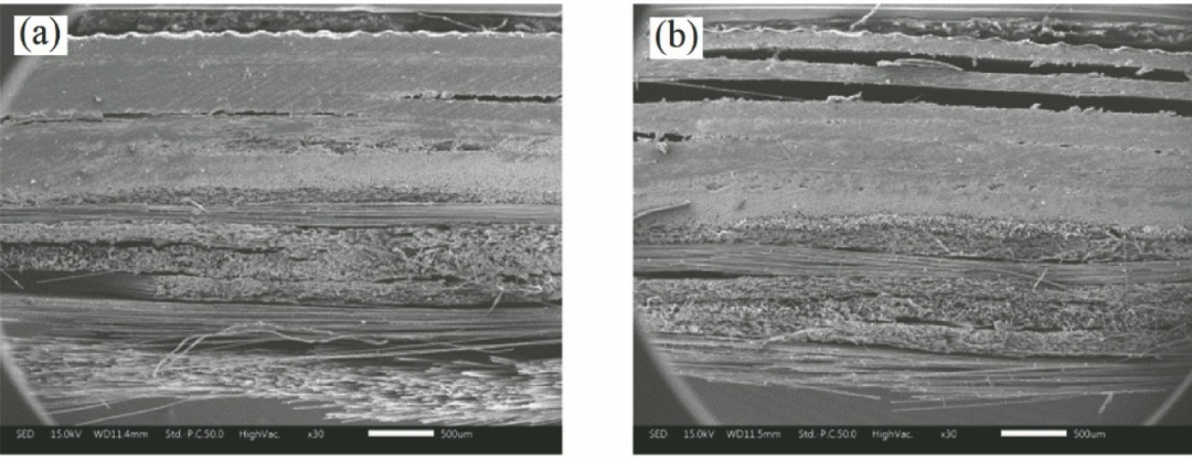 圖4 不同功率激光導致的層間開裂:(a) 500 W;(b) 1000 W