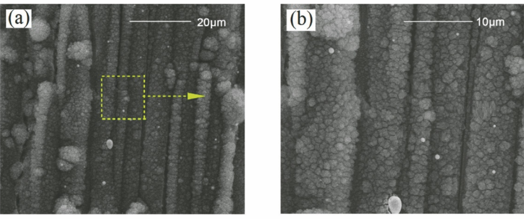 為了控制CMC-SiC中由激光熱作用導致的加工缺陷利用超短脈沖激光對CMC-SiC 進行精密加工成為國內(nèi)外學者研究的熱點。蔡敏等對比了納秒激光和皮秒激光的SiC/SiC加工效果,結(jié)果表明:納秒激光加工過程中材料表面同樣存在熱影響區(qū),導致激光輻照區(qū)域產(chǎn)生了重鑄層、分層及微裂紋等缺陷;利用皮秒激光加工,相對納秒激光,SiC/SiC的加工質(zhì)量有顯著提高,激光輻照區(qū)域未發(fā)現(xiàn)熱影響區(qū),即重鑄層、分層、微裂紋等缺陷在皮秒激光加工中得到了有效抑制。Liu等利用皮秒激光開展了C/SiC的微孔加工實驗,研究發(fā)現(xiàn):當激光功率密度較低時,孔內(nèi)形成的反沖氣壓同樣較低,導致孔內(nèi)碎屑不能有效噴出;升高激光功率密度后,加工過程中孔內(nèi)產(chǎn)生強烈的沖擊波,形成的反沖高壓使得碎屑從孔內(nèi)高速向外噴射,微孔加工質(zhì)量明顯提高。Moreno等開展了飛秒激光加工纖維增強復合材料的實驗研究,發(fā)現(xiàn)內(nèi)部基體材料的尺寸和形狀對激光加工質(zhì)量存在較大影響。在飛秒激光參數(shù)的合理調(diào)控下,纖維增強復合材料獲得了良好的加工質(zhì)量。Zhai等在SiC/SiC上利用飛秒激光進行了多種微結(jié)構的制備研究,檢測報告顯示SiC/SiC加工區(qū)域輪廓清晰,沒有出現(xiàn)機械加工常見的崩邊、纖維拔出,以及長脈沖激光加工中明顯的熱影響區(qū)。為了驗證加工效果,利用飛秒激光在SiC/SiC表面制備了大面積的微槽結(jié)構,加工效果如圖8所示。